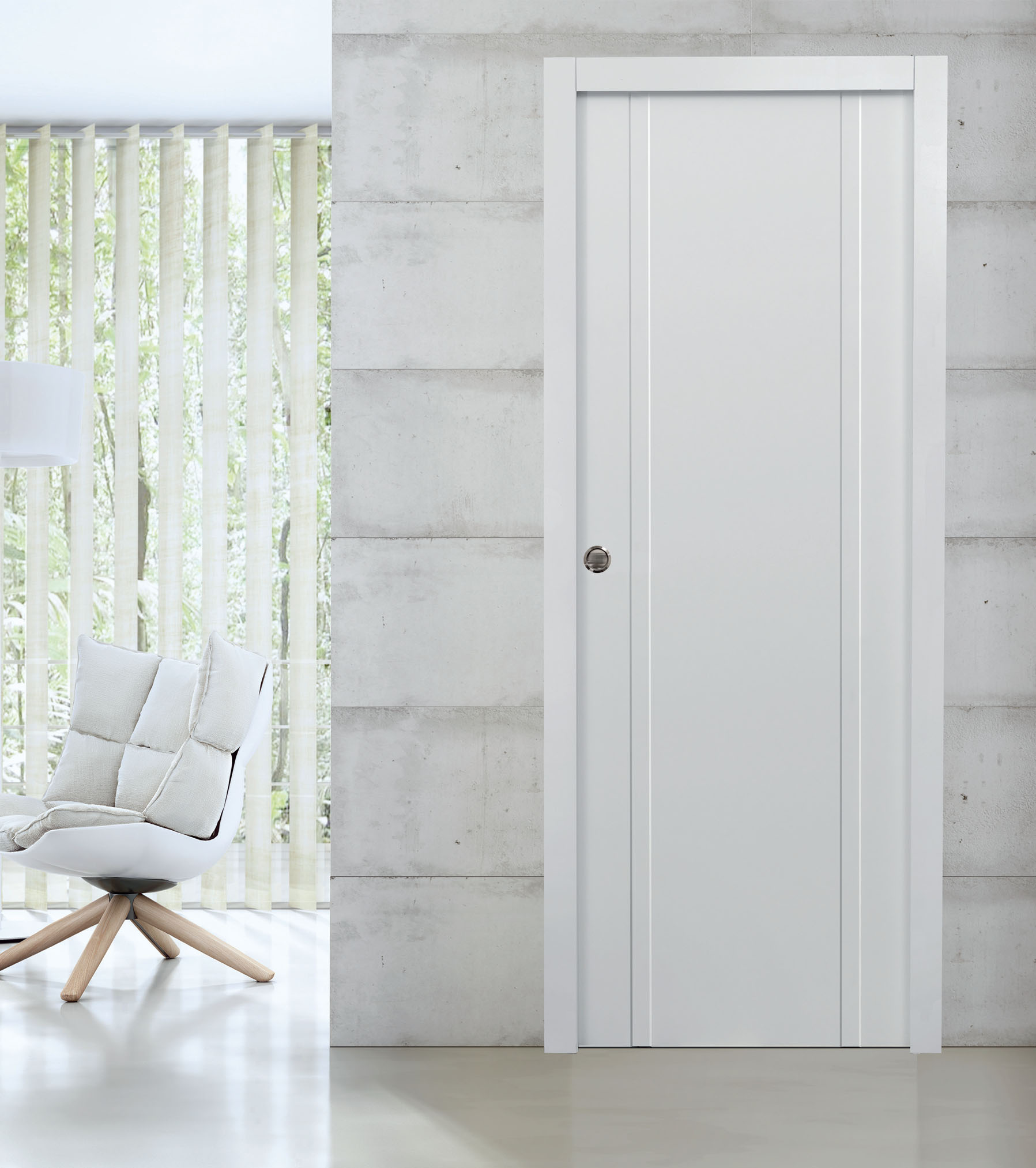 Una puerta en color blanco con relieve que consiste en dos líneas verticales a cada lado de la puerta para un modelo en el que la elegancia es una de sus virtudes. Ideal para estancias en las que prima la sencillez.