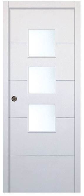Las puertas correderas son ideales para ahorrar espacio y aportar un extra de luminosidad. Esta puerta, lacada en blanco con tres manos y tratamiento antiamarilleante, al igual que el modelo anterior, es una puerta que se caracteriza sobre todo por la modernidad de sus líneas. Para hogares de nueva generación que apuestan por los nuevos diseños.