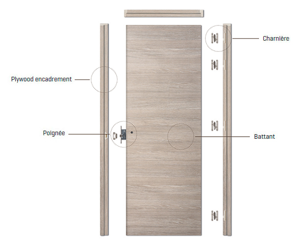 Le bloc-porte se compose de battant mécanisé, encadrement, heurtoir et 4 charnières.