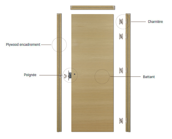 Le bloc-porte se compose de battant mécanisé, encadrement, heurtoir et 4 charnières.